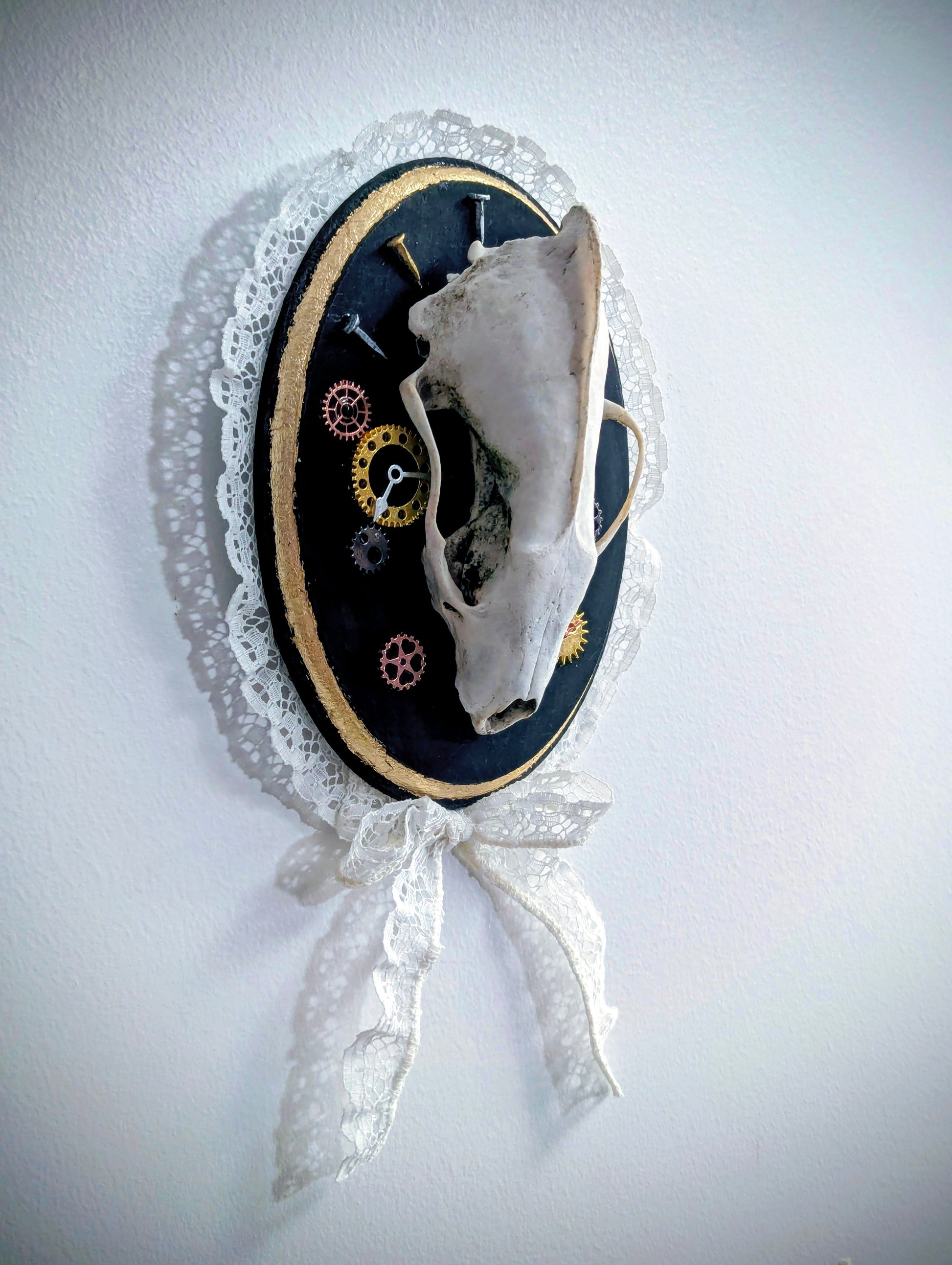 This handmade wall mount blends natural form with mechanical imagination. At its center rests a carefully prepared fisher skull, displayed on an oval plaque with a deep black backdrop and antique gold detailing.