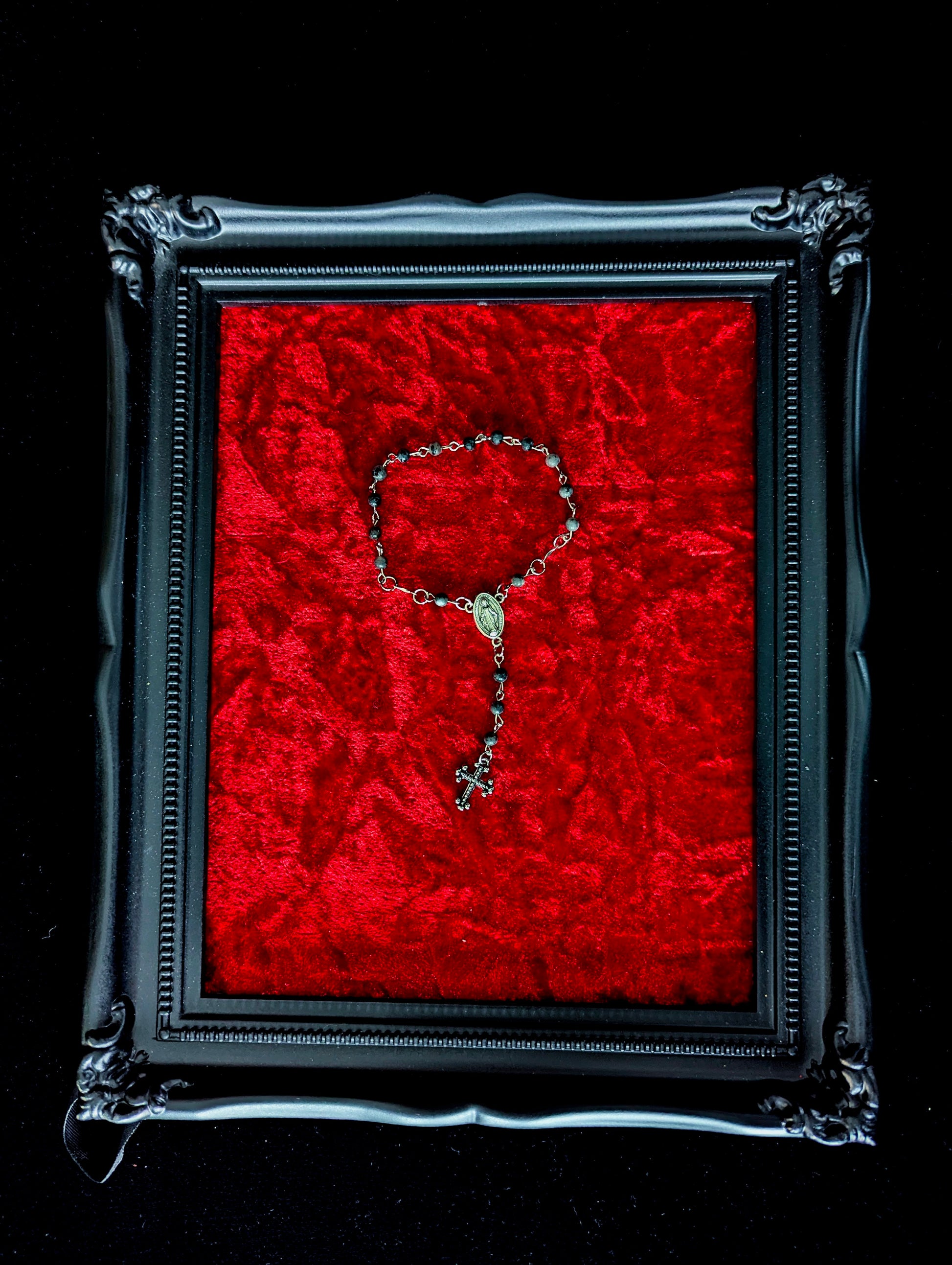 At its end rests a detailed cross, symbolizing faith, sacrifice, and protection. The combination of grey stones and antique-style metal elements gives this rosary a timeless, dark elegance, perfect for those drawn to sacred symbolism with a gothic edge.