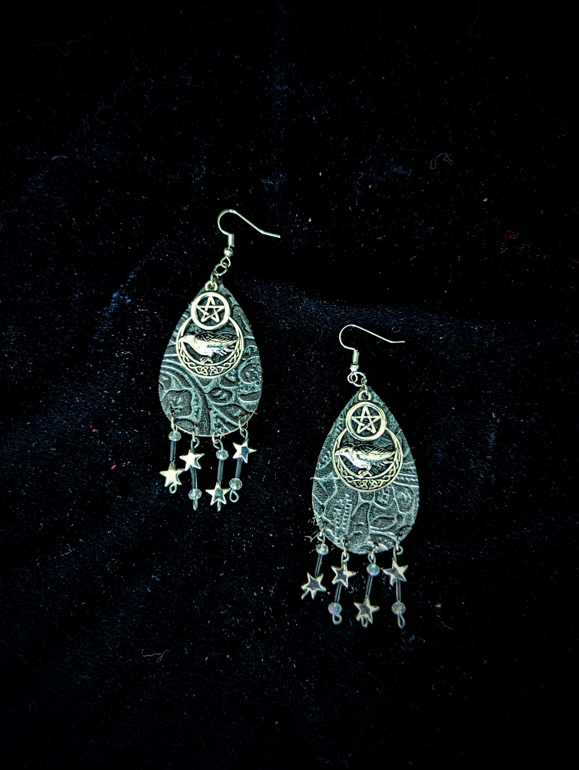 These striking handmade earrings are crafted from black and silver-toned textured leather, layered to create depth and an ancient, ritualistic feel. At their center hangs a pentagram symbol paired with a crow pendant, evoking protection, mystery, and the wisdom of shadowed paths. Delicate dangling accents with small stars and beads add subtle movement and a whisper of celestial magic.