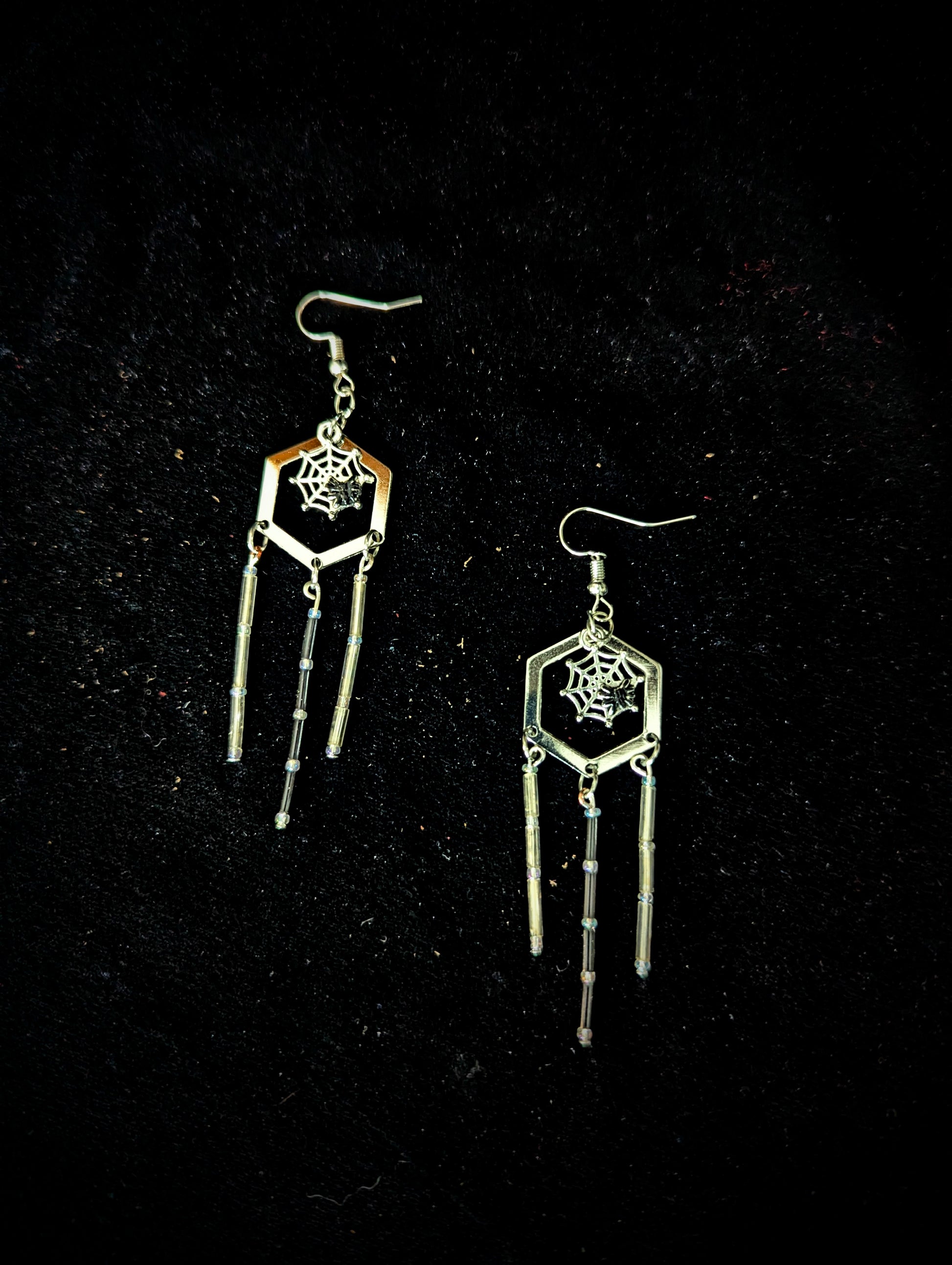 These handmade earrings feature a hexagonal metal frame adorned with a delicate spider and web pendant. Suspended below, slender dangling elements add graceful movement, giving the piece an elegant yet eerie presence.